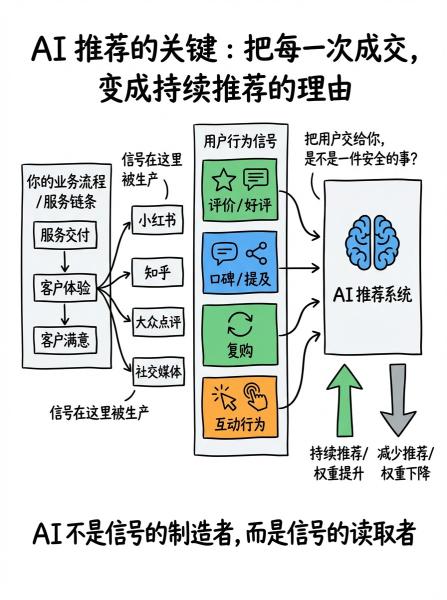 AI不会跑到你店里看你服务得怎么样,但AI会看你的客户在互联网上留下了什么痕迹。你要做的,是在自己的服务流程里设计好触发点,让每一个满意的客户,都变成一条AI能识别的正向信号。